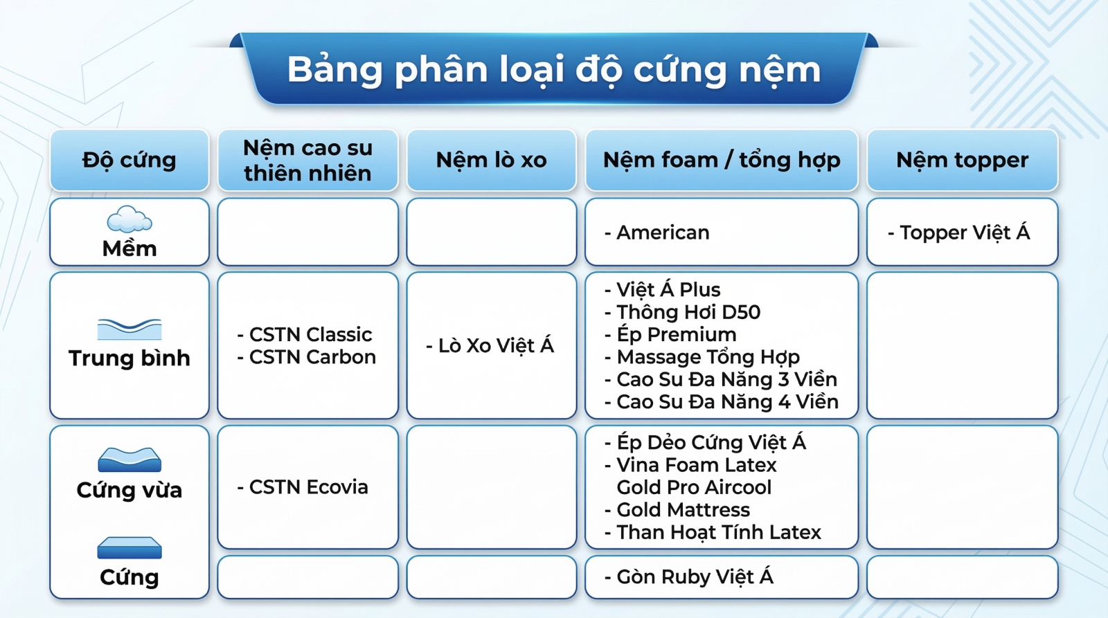 3. Bảng so sánh độ cứng Nệm Việt Á